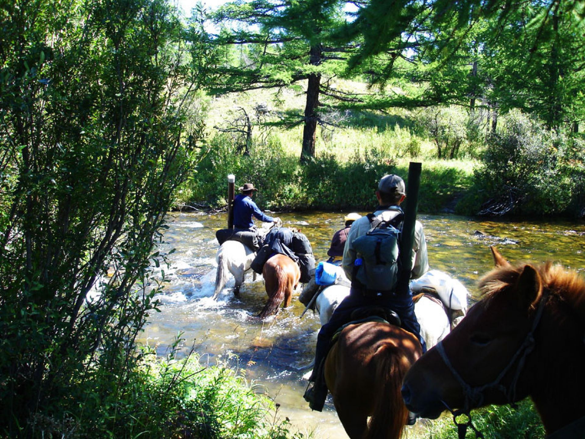 Oczywiście koni nie ma. Trzeba je pozbierać a to nieco potrwa. A po co się speszyć, przecież jutro też jest dzień. Tu upływ czasu ma inne znaczenie. Przepływamy rzekę jedną z nielicznych w tym kraju łodzią, za nami nasze konie. Większość z nas po raz pierwszy siedzi na koniu, miny takie sobie. Koniki malutkie, dzikie i krnąbrne . Po za tym nie kumają po polsku. Jak się okazało są też inaczej ujeżdżane niż nasze. Tam wodze trzyma się w jednej ręce skręcając nimi łeb zwierzęcia. Jak zechce to kieruje za nim resztę ciała. Droga jest mocna. Ścieżka jak dla kozic, przeprawiamy się przez bagna i kilka mniejszych rzeczek.